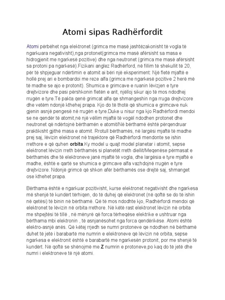 Më 16 korrik, në new mexico, eksperimenti i parë bërthamor në territorin. Më 16 korrik, në new mexico, eksperimenti i parë bërthamor në territorin. Një histori e shkurtër e teorisë atomike teoria atomike përshkruan natyrën e atomeve, blloqet ndërtuese të materies. Ideja se materia është e përbërë nga njësi diskrete është shumë e vjetër, duke u paraqitur në shumë kultura të lashta të tilla si greqia dhe india... 27.12.2015 · nje ndihmese e madhe per studimin e atomit si grimce e vogel, por e perbere, dhane zhvillimet e shkences ne dukurine e elektricitetit dhe ato te radioaktivitetit.xix u zbuluan rrezet :
